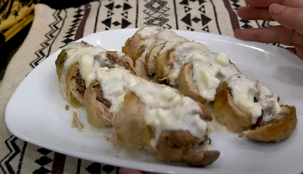 - نلف كويس الدجاج بشكل دائري على الحشو , نستخدم البلاستيك الغذائي في ذلك و نغلقه من الطرفين .