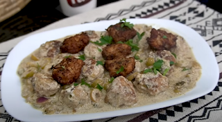 - على صحن التقديم نضع الخليط الذي طيبناه سابقا و نزينه بخبيزات الكفتة المقلية من فوق و القليل من المعدنوس .